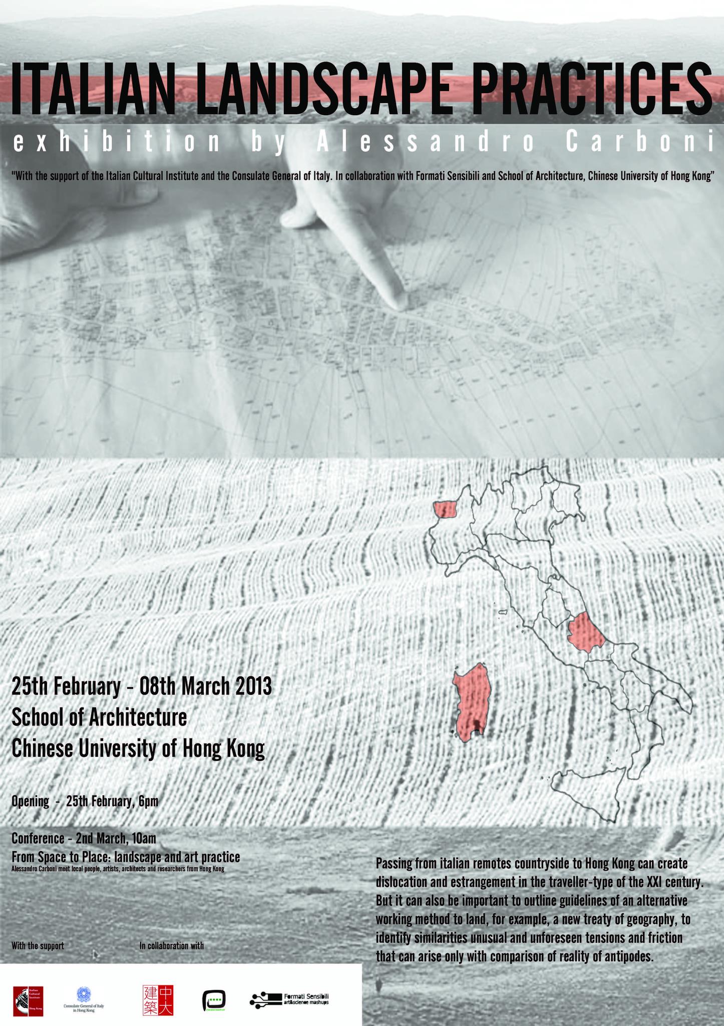 Passare dai remoti paesaggi rurali a Hong Kong può creare un certo straniamento nel viaggiato retipo del XXI secolo. Ma può anche essere importante per delineare le linee guida di un metodo alternativo di lavoro, per esempio un nuovo trattato di geografia, che permetta di individuare le insolite somiglianze, le tensioni impreviste e gli attriti che possono sorgere solo con il confronto di realtà agli antipodi tra loro. Italian Landscape Practice è una raccolta di foto, video e testi di Alessandro Carboni. L’artista ha esplorato gli stupefacenti paesaggi italiani in tre differenti regioni: Abruzzo, Valle d’Aosta e Sardegna. In ciascuna di esse l’artista ha sviluppato progetti interdisciplinari focalizzati su particolari aspetti del patrimonio culturale, dall’ambiente alle persone, dall’agricoltura all’architettura, ecc…