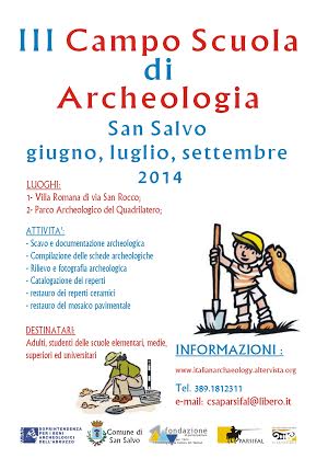 Aspiranti archeologi dagli otto anni in su si cimenteranno la prossima estate nella ricerca di reperti per ricostruire la storia. Gli scavi avranno luogo nel sito della Villa Romana di via San Rocco a San Salvo, sede principale del Secondo Campo Scuola di Archeologia, un esperimento della Parsifal Società Cooperativa inaugurato nell’estate del 2012.