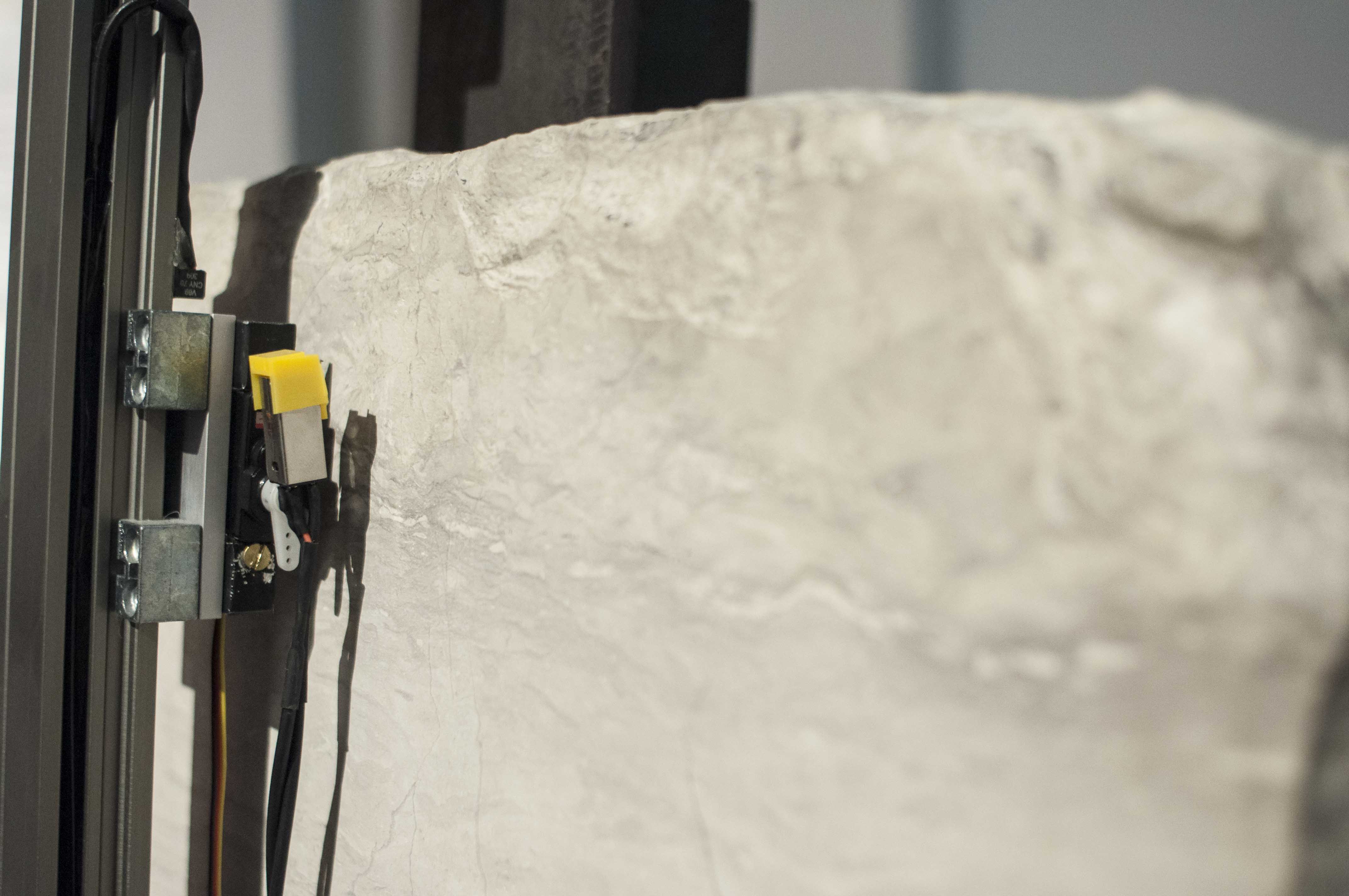 The exhibit is contained within the many alcoves that gallery offered and each offered differing reactions. The low pitched humming of the stone centrally placed in the largest room of the gallery (Articolazioni Oltre il Linguaggio, la materia ed il suo ritmo, 2013 – 2014), combined with the acoustics of the high ceilings creates at instant atmosphere of excitement and industry – quite at odds with the significance the piece illuminates. This area displays works by Elena Mazzi and Elisa Strinna, including a vocal arrangement of American equities on a screen (Articolazioni Oltre il Linguaggio, la materia e le sue declinazioni, U.S.A. Equities 1871-2011).
