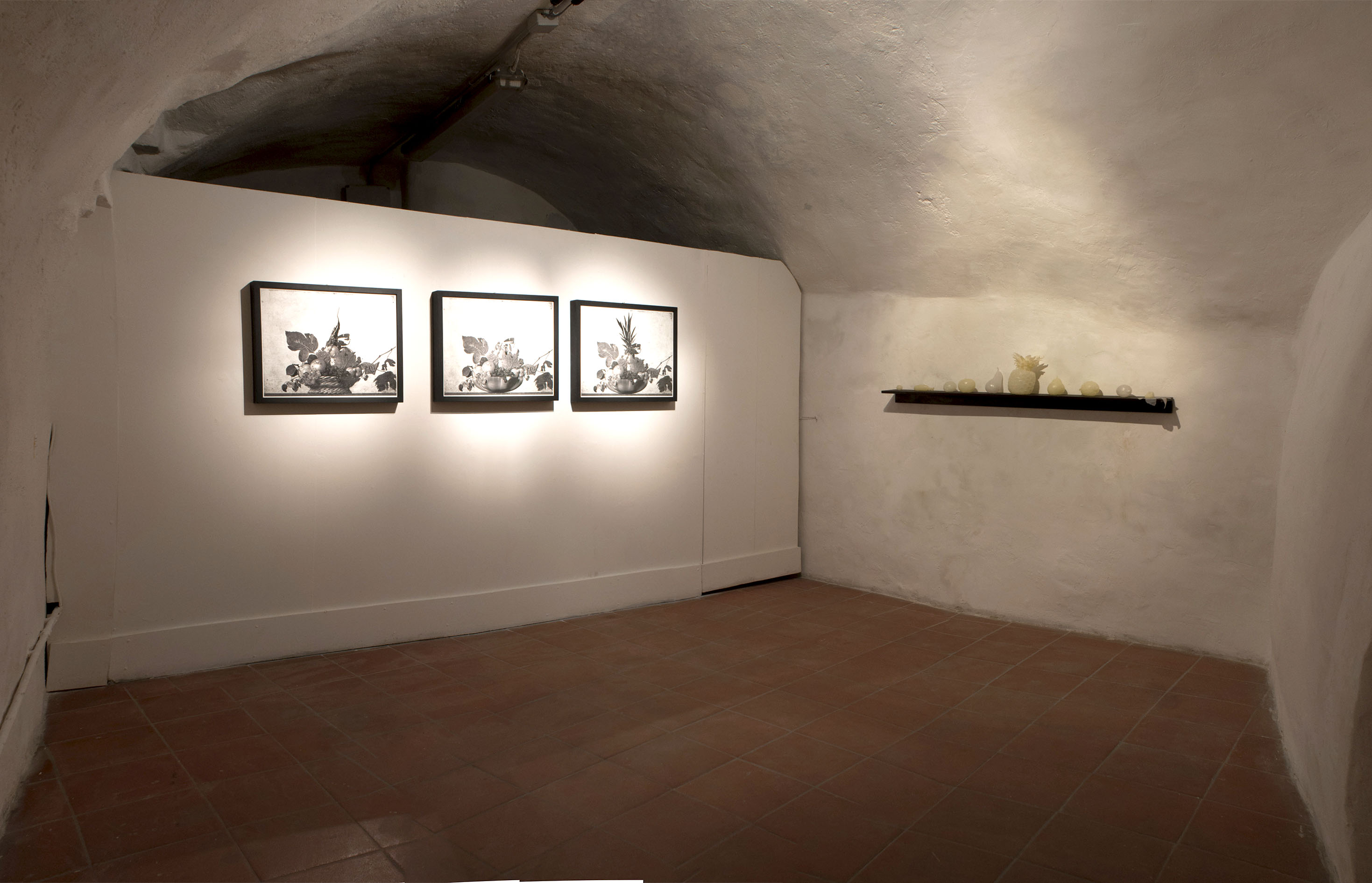 The lower floor level contains the work of Elisa Strinna. The famous fruit basket of Caravaggio has been re-worked in mono prints outlining the globalization of the relationship we have, and had with nature. Exotic fruits have been beautified, outlined with glossy veneers and exteriors, whilst across the room we find the silicon husks of the same fruits, empty in the promise of delight. Although each aspect of the collection denotes an important message to the audience, it is difficult for those unenlightened to derive meaning behind the obvious aesthetics of each piece ‘mi piace, è bellissimo’ was a prominent response to the film shown and this is something to highlight. The notion of beauty in context should be irrelevant however it is a continuing epidemic of human nature to firstly notice the beauty in something, regardless of its message or significance.