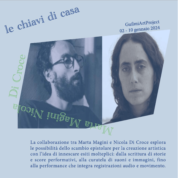 Innocente modo di dire per accogliere i primi artisti in residenti del 2024, arrivati a ridosso del capodanno, ancora con discreto hangover. Quel tanto che basta per avventurarsi nelle remote lande di Guilmi nella stagione più fredda dell’anno. In realtà c’era il sole ad accogliere Marta Magini e Nicola di Croce alla stazione di Vasto e pure un buon pranzo di pesce che fa tanto estate. Gli artisti hanno svolto a GuilmiArtProject la prima fase della ricerca su scrittura, suono e movimento degli artisti. Potete leggere di più sulle loro intenzioni qui.