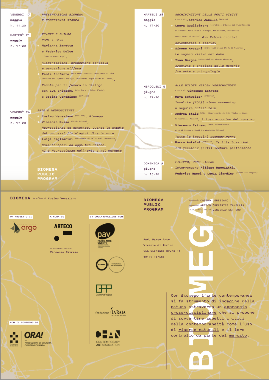 Parallelamente l’artista Cosimo Veneziano in collaborazione con il Dipartimento di Neuroscienze dell’Università IULM di Milano realizzerà un’opera transdisciplinare sull’uso delle biotecnologie in ambito agroalimentare, che sarà una riflessione sui procedimenti di acquisto dei consumatori in relazione alle attuali tendenze di neuromarketing. Le opere dell’artista Veneziano saranno presentate coinvolgendo varie sedi espositive tra cui Fondazione La Raia a Novi Ligure (AL) a cura di Ilaria Bonacossa, la mostra “Ka art. “Per una cartografia corale della Basilicata”, a cura di Katia Anguelova, progetto di Matera Capitale Europea della Cultura 2019 co-prodotto dall’associazione ArtePollino e la Fondazione Matera-Basilicata 2019, e CAMERA. Centro Italiano per la Fotografia a Torino.