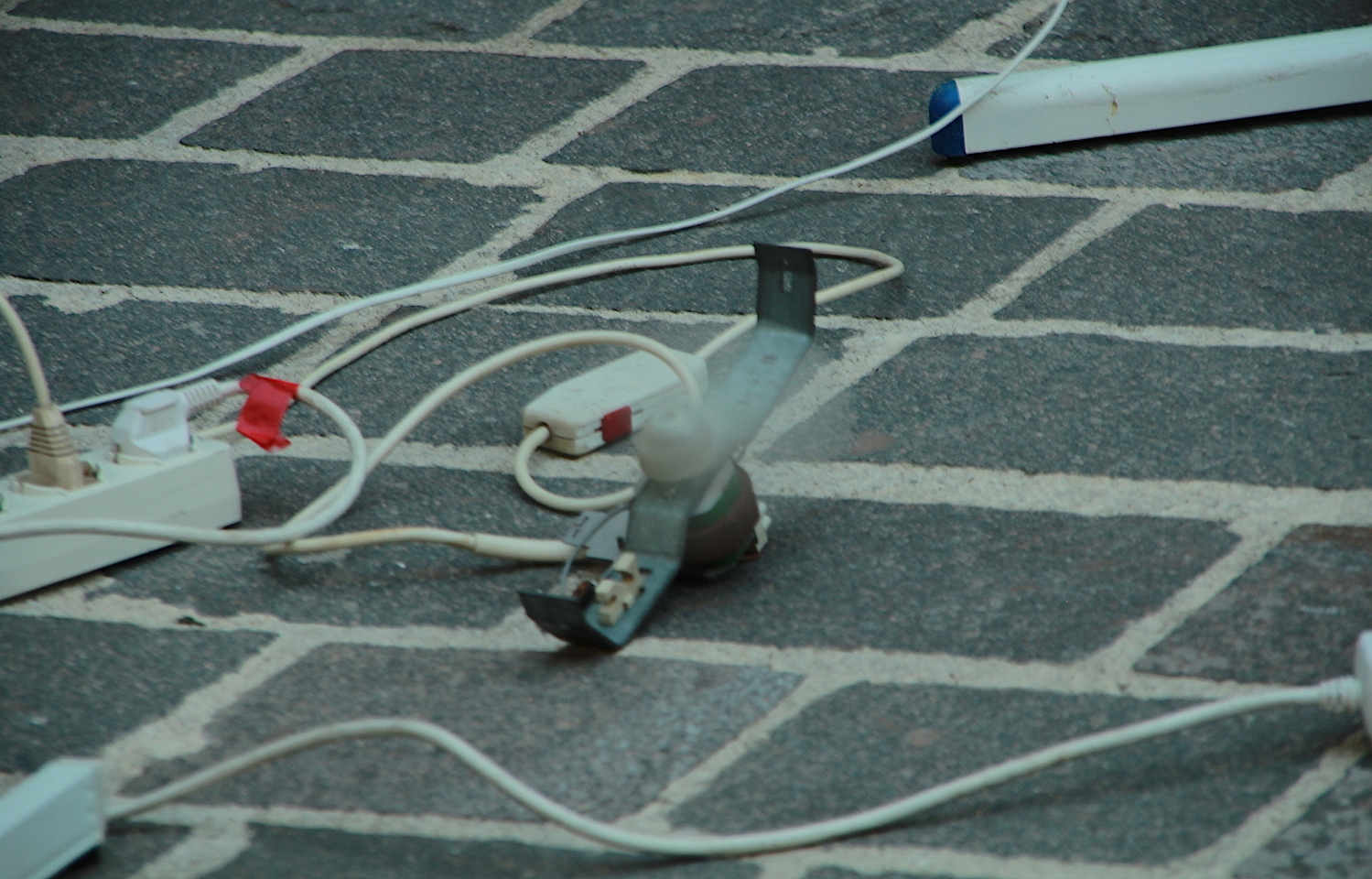 Con Alì e Paride abbiamo cercato di raggruppare un numero consistente di ventilatori. Con quest’ultimi abbiamo poi costruito un’istallazione. Azionandoli sullo stesso tempo e lasciandoli immobili abbiamo ricreato una condizione statica. Per conferire del dinamismo a tale condizione era necessaria l’azione della gente che compiendo un atto ludico (cioè giocare semplicemente con i ventilatori), avrebbe modificato il risultato di partenza. Un atto imprevedibile considerando i tabù che spesso “l’opera d’arte” genera ad un pubblico non dell’arte.