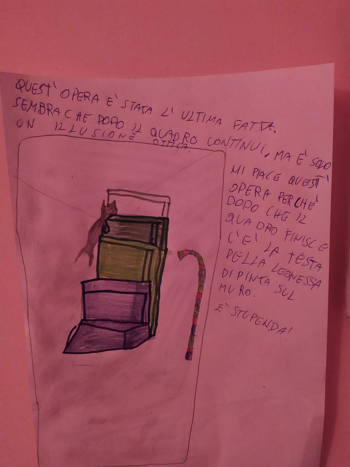 M.: L’unica cosa che mi ha colpito è stato vedere lo sguardo stupito dei bambini, nel vedere il quadro in camera, ma loro non hanno apprezzato. Mi aspetto di vederli entusiasti e desiderosi di scoprire quello che stanno vedendo.
