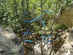 Nicola Toffolini was the summer 2011 artist in residence in Guilmi, Abruzzo. Nicola works with nature and the idea capturing and taming it. In Nicola’s past work he created the environment for nature, construction miniature hermetically sealed greenhouses (ie. Ciclico ambiente polifonico per piante claustrofobiche, installation 2003. Courtesy LipanjePuntin artecontemporanea) that are displayed as sacred relics. However in Guilmi he had to work within the environment, essentially trying to trap it from the inside – a reversal of his usual work.