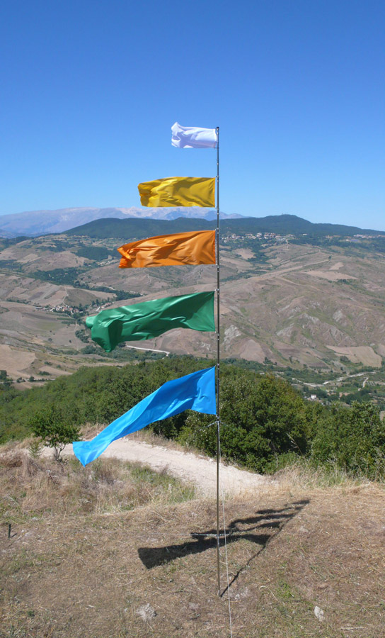 Nicola’s usual pieces are very precise. He works with nature; but this does not mean that he only uses natural objects. Nicola had his anemometer flag, Il vento fa il suo giro (part of one of the installations in Guilmi) made from polyester and the pole made from steel. The production actually posed a problem for him, as he did not have access to specialized craftsmen, but plumbers and woodworkers. He did, however, find a store in the nearby area of San Salvo which specialized in flag making. Other works in this series of installations are less manufactured; they can be likened to Giuseppe Penone’s Tree Series (1968-1978) in which he placed cast steel reproductions of his hand on trees outside**.