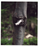 In the forest you come to a grouping of trees, all attached by bridges; strange branch-mimicking forms. The color is abrasive to the eye; an obviously unnatural blue. There is something very industrial about it; like a color that would be found on scaffolding. The stones below are pure white; no tree could have grown from this hard land. Nicola cleared away all the dead branches that had fallen to the ground, as well as the ones still left on the trees, and all the small rocks in the area. Clean white stones were brought from the nearby river and placed onto the cleared earth. Wood was cut into varied sizes, painted a sapphire blue, and placed between the thin trees. Nicola creates tension between the trees by placing these pieces of wood between them. He creates a disturbance in the equilibrium of nature. He binds the wood tightly to each tree; this binding strangles the trees and keeps them from swaying and growing as they naturally do.