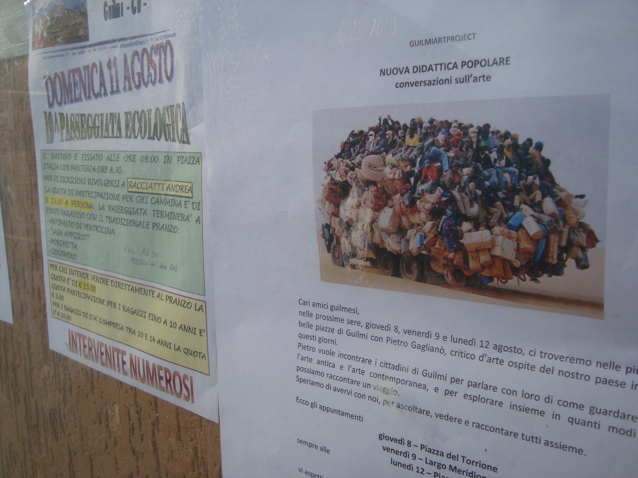 Di fronte a quelle immagini scorse nelle tre serate della Nuova Didattica Popolare mi sembrava che i volti dei guilmesi s’illuminassero di un misto di stupore e d’intuizione con frequenze sempre più prossime e appassionate. Ecco allora cosa significava quell’apparente inutile andirivieni per i campi di Alessandro Carboni nei tre video esposti alla Pitech qualche anno or sono![1]. Non significava assolutamente niente! O meglio, niente di quantificabile in termini di un utile su un libro paga; niente che recasse profitto in soldoni: Alessandro Carboni stava facendo soltanto un gesto artistico che, in quanto tale, è assolutamente gratuito, ma non per questo meno profondo. ANZI, proprio per questo, assolutamente significativo, non indifferente o intercambiabile. Accompagnato dall’instancabile adagio di Francis Alÿs che travasa acqua da un mare all’altro, o da una più comune Fuga in Egitto, Pietro Gaglianò conduceva i guilmesi a siffatto turbinio di pensieri, che finalmente s’allineavano nel corridoio del senso.