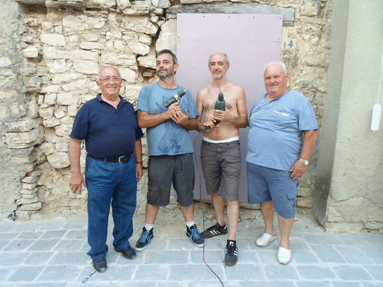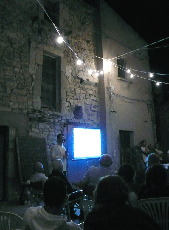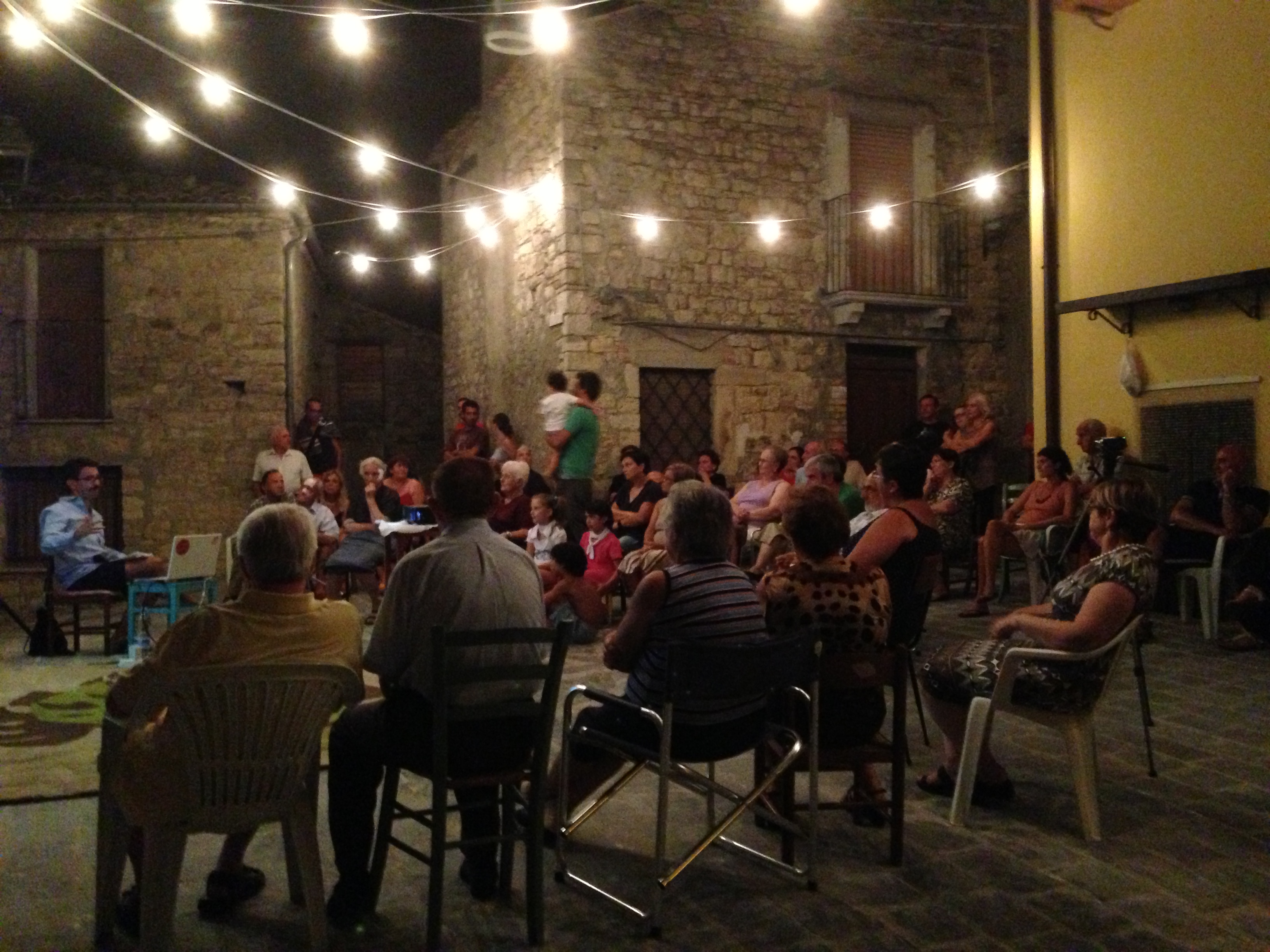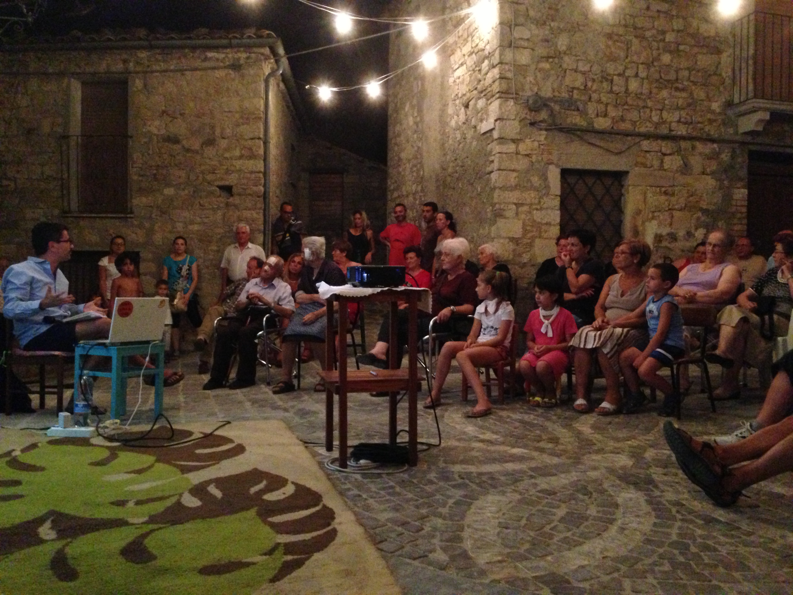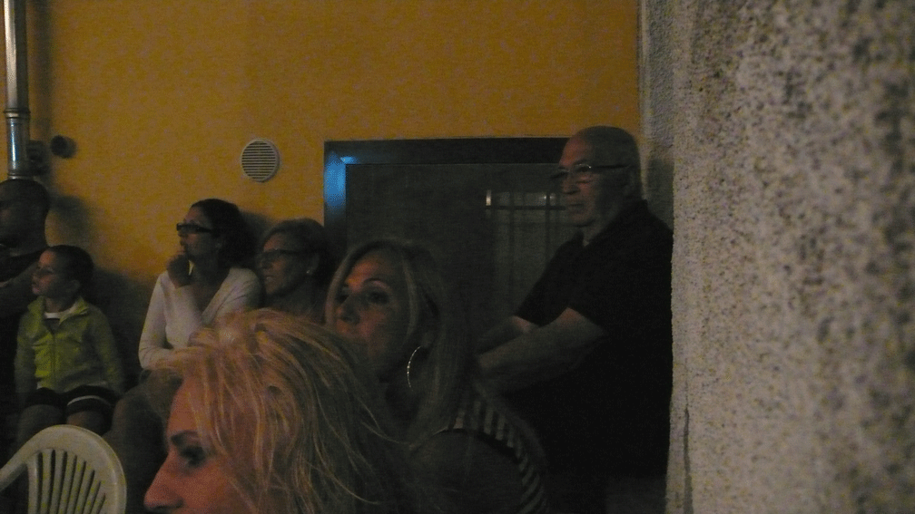 Al secondo appuntamento Pietro dava istruzioni, condivideva memorie private, entrava nell’intimo degli astanti, tramite fotografie portate da casa, interrogazioni trasversali al prete – confidente di tutti – , e alla più devota, che notoriamente, del paese intero, conosce i vizi e le perversioni più intrinseche. Se già la sera prima avevamo scoperto della fuitina di Nicola e Giuseppina, raccontata dai protagonisti ultra ottuagenari (insieme da più di 70 anni, i due siedono l’uno accanto all’altro, entrambi romanticamente, ma casualmente incerottati), nel corso di questa serata scopriamo di altre fuitine, magari solo immaginate, con personaggi esotici, che non parlano la nostra lingua, ma con un cuore grande così… Il ritrovo al freddo-ventilato del 9 agosto, con i racconti sull’aborigeno e le note melanconiche sull’India, regalate da don Raji, si è trasformato in un focolare esotico, che a tirare su col naso sentivi un misto di effluvi di terra calda, curry e d’aria frizzantina tipica della collina su cui sorge Guilmi.