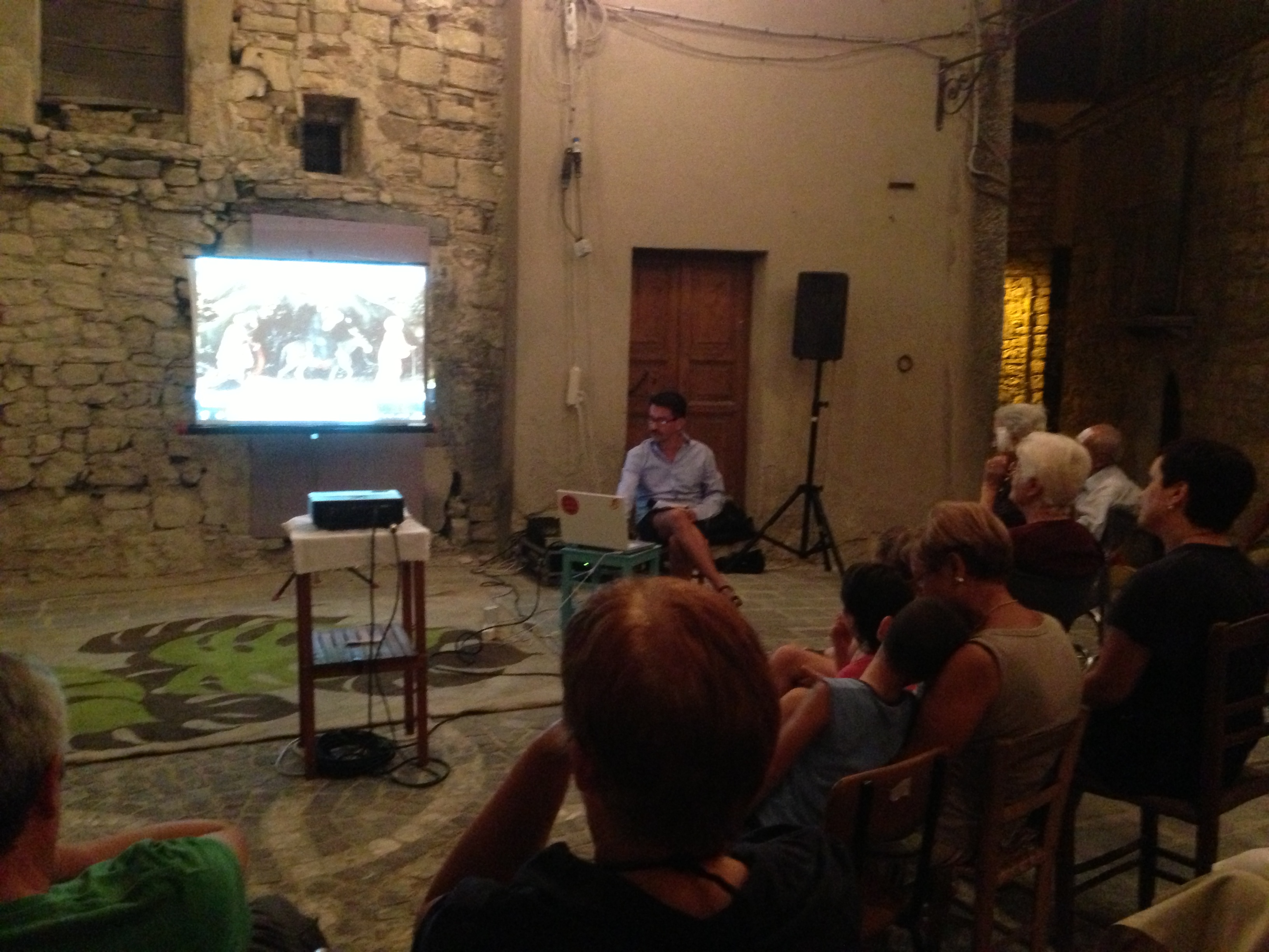 Il primo in programma è stato ovviamente un momento di studio per la preparazione di un piano d’azione verso un pubblico molto speciale. L’incedere cauto e circoscritto, misto alla dichiarazione d’intenti che Pietro è andato a fare, ha reso la serata fuori dal comune, sincera, riscaldata da un innamoramento conquistato con la ponderazione, più che con l’effetto speciale. Coadiuvato da warburghiane, immagini d’opere d’arte, clip di film, e gli immancabili riferimenti letterari che ne contraddistinguono l’oratoria e la scrittura, Pietro Gaglianò ha illustrato il tema viaggio in tutte le sue possibili declinazioni, tramite l’esplicitazione dell’opera di artisti antichi e moderni. Intrattenendo alcuni ed educando i neofiti, Pietro ha agito su due livelli: di conoscenza da una parte, preparando le fondamenta per la costruzione di un proprio tempietto individuale del sapere; e umano dall’altra, cementando il consenso, la fiducia e l’entusiasmo che lo hanno accompagnato per le serate successive.